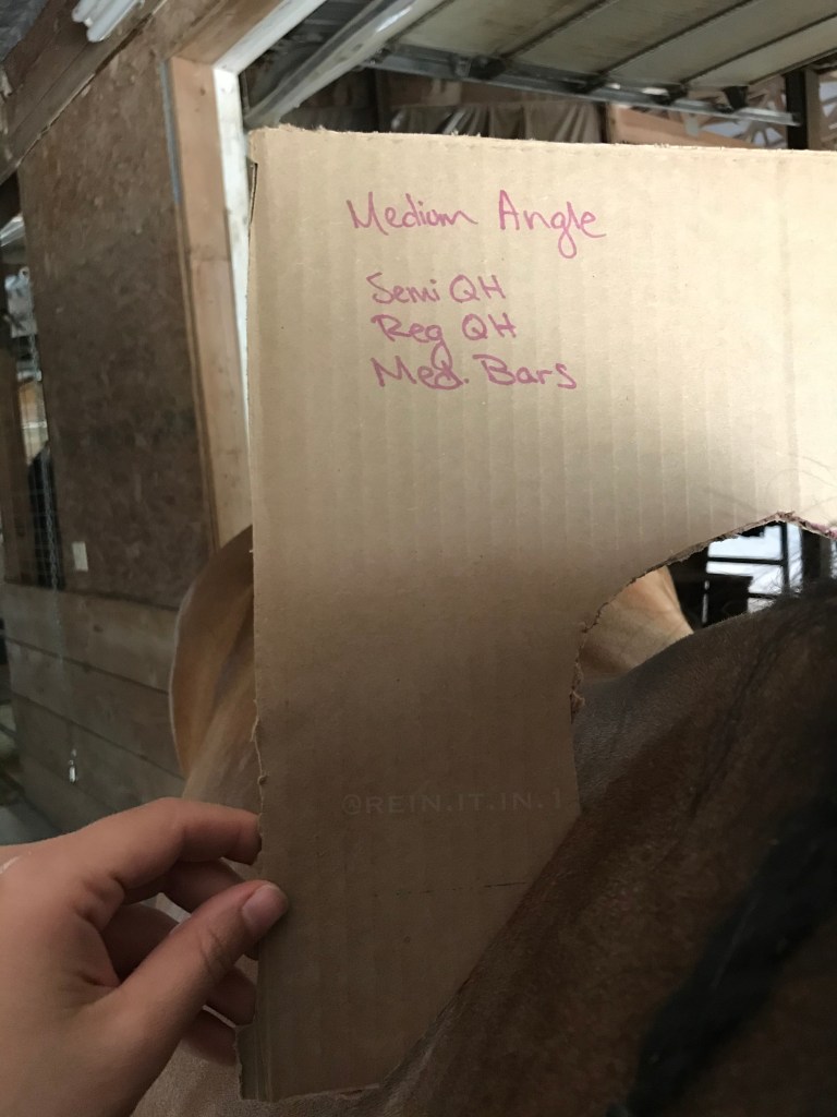 Horsesaddleshop.com is a great resource. They have these printable templates for standard/semi and full quarter horse bars. I printed them, cut them out, then taped them to cardboard, and cut cardboard to that template. From there, you place the template on your horse’s back, right behind the scapula. The upper piece of the template, which mimics a saddle’s mantle, should be free and clear of your horse’s withers. You want the angled piece to sit flat against your horse’s back, with complete contact, without any pressure from you. You should just be holding the template upright and not pushing down. If it doesn’t fit properly, you’ll see one part of the angled piece hit the back, then the opposite end not making contact with the back. So it will look like it’s pinching either on the top near the withers (too wide bar angle) or bottom (too narrow).