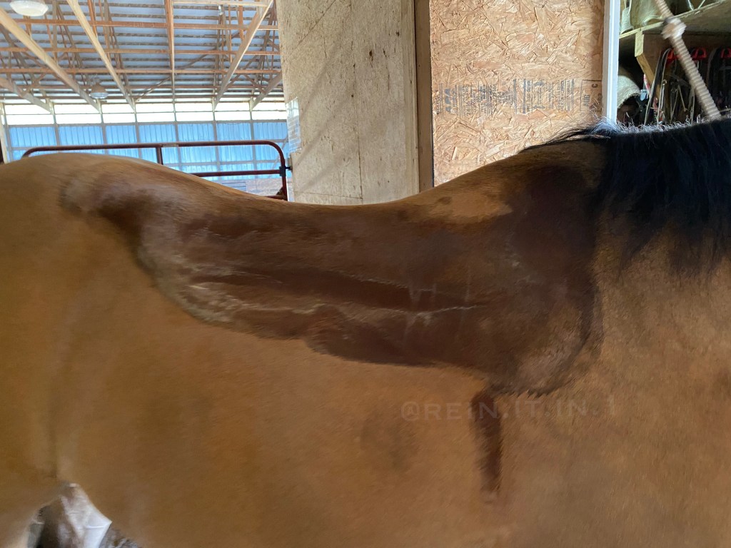 The big dry spots are indicative of well fitting bars. Sweat needs air. So if those bars are making good, complete contact behind the shoulders, then it doesn’t let airflow in. This isn’t necessarily a bad thing, it doesn’t cause pain, it just isn’t conducive to sweat forming. No white spots form and no hard tissue spots form with a big dry spot. I have tried a lot of saddles, and El has never had a saddle not form a dry spot. The difference is that the ill fitting ones left a quarter sized dry spot while the saddles that seemed to fit the best left and hand sized dry spot behind the shoulder. Once I swapped to a better fitting saddle, the chiropractor noticed that my mare was no longer sore at her shoulders, despite the big dry spot. So for now, that’s my opinion.