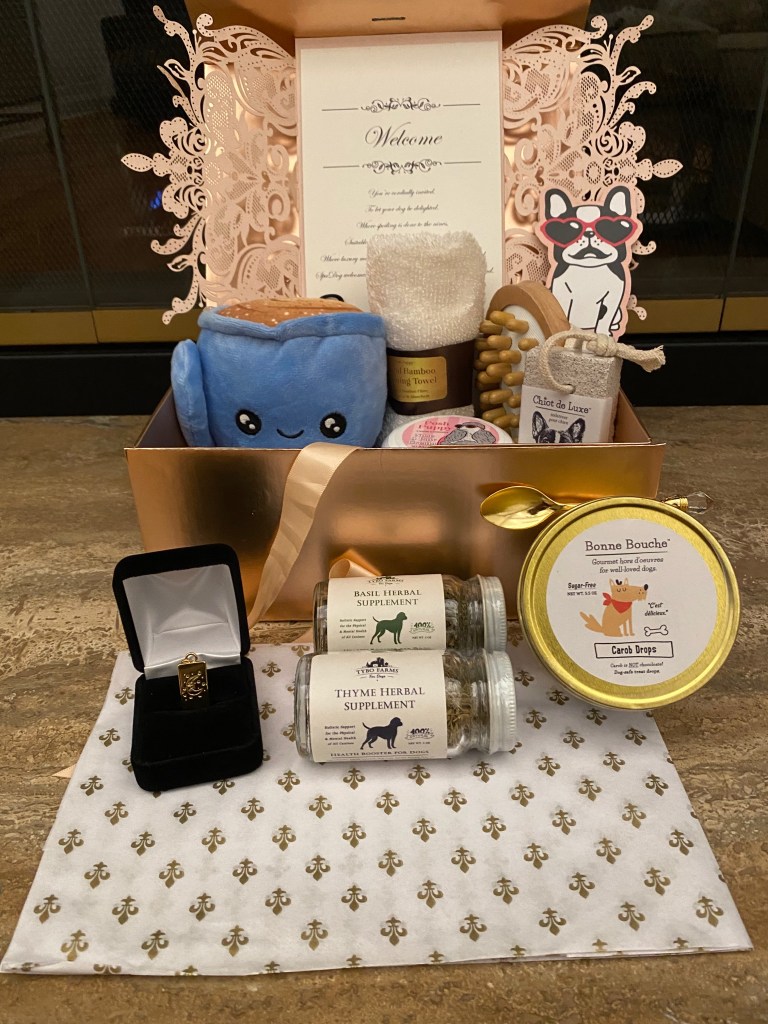 In the box, the girls received only 1 toy (thank goodness), a massage brush, the softest grooming towel, a pumice stone for their paws and nails, dog safe pure shea butter for their noses and paws, all natural dog food supplements (basil and thyme), a pendent for them to wear on their collars, dog safe carob chips, a turducken chew, and a gold spoon (like, literally a beautiful metal spoon) that I believe is for the carob chips or shea butter.