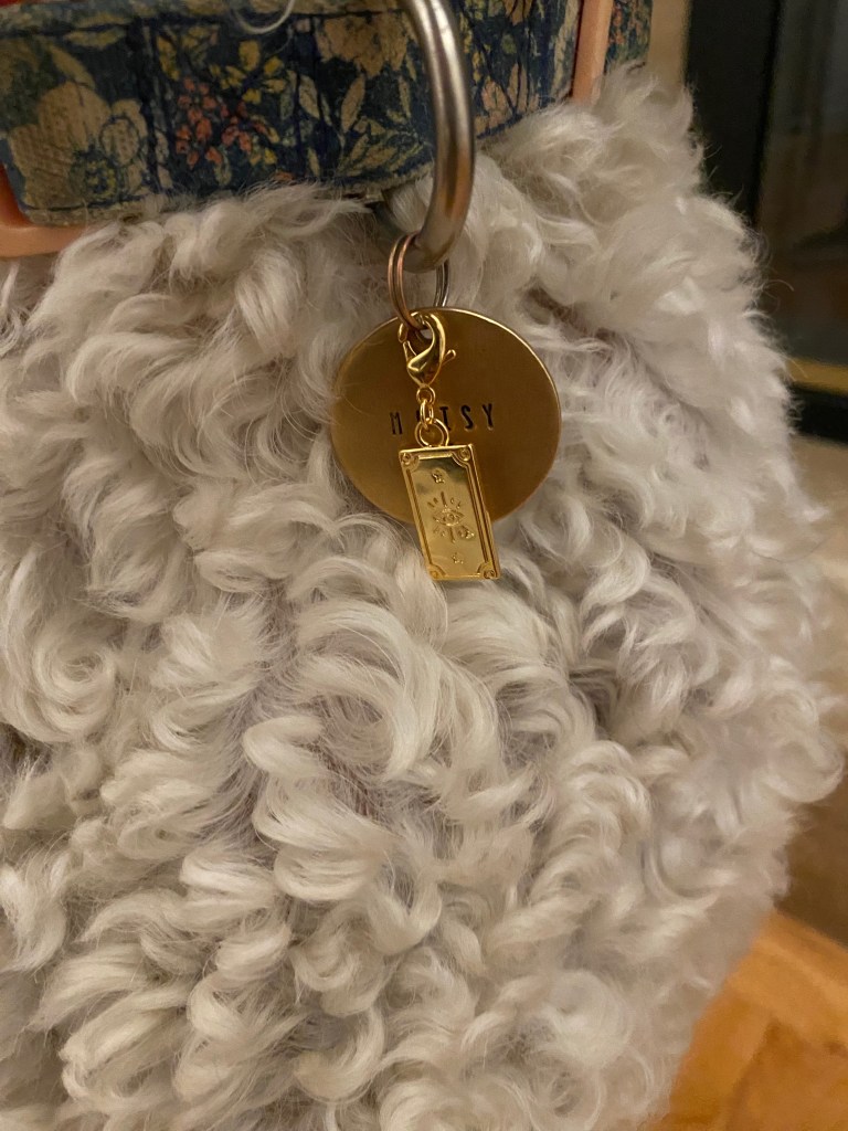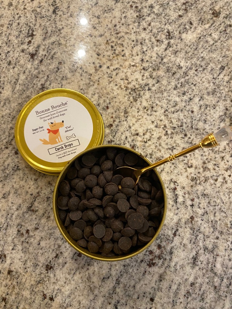 Sierra was a big fan of the massage brush. While Maisy happily chewed on the turducken chew, Sierra got her paws pumiced followed by the shea butter. She certainly enjoyed it, laying down with one paw willingly and tenderly given to me, and looking at me down her nose as if to say, “I’ll be checking your manicure skills when you’re done”. Her paws were so soft after and she seemed quite pleased with the pampering. The cute pendent had some bohemian vibes, with a crescent moon on one side and an evil eye on the other side. For those that don’t know, an evil eye is worn to keep bad vibes away. Due to Maisy’s anxiety, I figured she could use some evil eye help so she was given the pendent to wear and it looked lovely on her. They were each given carob chips on their super fancy spoon and I’m sure they now expect to be fed via gold silverware everyday.